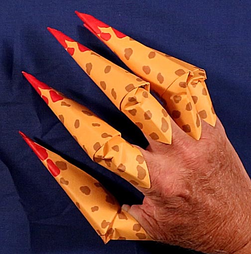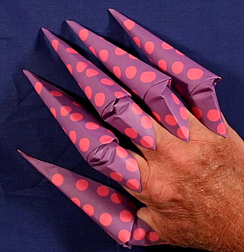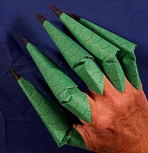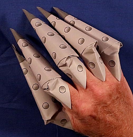 Crayons or felt pens can be used to color them, but the results are uneven. A much better option is to print out designs, which when folded produce claws like The Creature From The Black Lagoon already shown above or the ever-popular zombie claws...