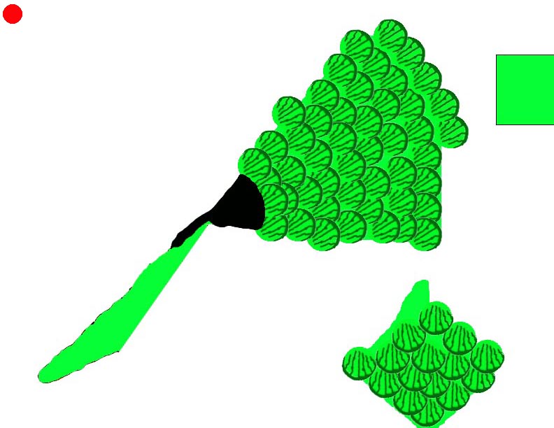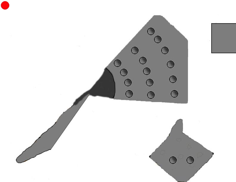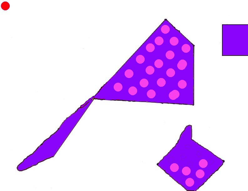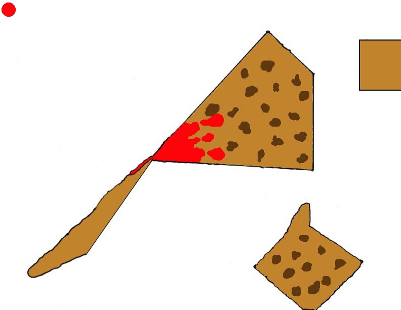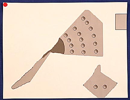 Its odd shape is designed so that only the areas that show are printed to avoid wasting ink. The main triangular area is the top, sides and bottom of the claw. The diamond shaped block with the two rivet heads is the area that covers the knuckle. The other areas cover the edges of folds that would show up as white lines if they weren't colored. The red dot in the upper left corner is an index mark to help position the paper for folding so the claw comes out with the printed areas where they belong.