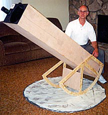 This one's more weird than insane. During my telescope-building phase I constructed a seven-inch unobstructed telescope using an off-axis paraboloidal mirror. While such scopes are extremely rare, that hardly qualifies it for this page. What does is the mount created for it. I had the idea of simply resting the telescope on a surface that would conform to the shape of the telescope's skids so that the scope would be held in whatever position it was placed without the necessity of locking clamps or complicated counterweight systems. The solution was in the bed, which consisted of two sheets of plastic with a thick layer of Crisco (the baking fat) between them. It worked, as far as the telescope was concerned. The problem was that walking on it was like walking on ice covered with oil.