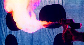 When I was in high school I got an idea of how to build a small, hand held flame thrower. I whipped one together and was surprised at how well it worked... too well, actually. What I failed to realize is that it had two levels of operation and while showing it to my best friend it suddenly skipped from the low mode (shown above) to the high mode with the flames jumping out six feet. Since my friend was standing in front of it at the time and almost got incinerated you can imagine that he got even more excited about the gun's increased performance than me.