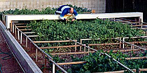As an avid gardener I was faced with the dilemma of gardeners all over the world: not enough space in the back yard. To maximize what space I had, I decided to eliminate walkways by building concrete rails over which a beam would ride. I'd lay down on a cart that rolled left and right over this beam and pulled on ropes to move the beam back and forth over the garden. This let me work the entire area of the garden without having to waste space on walkways and also made it so I wouldn't have to walk on the soil, compacting it. Odd thing: my neighbors began building their fences higher around my backyard after they saw this. I wonder why?
