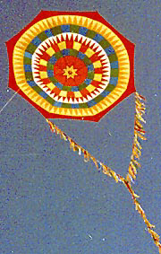 This kite might not seem to qualify as an insane project because while its 8-foot diameter makes it large it's not remarkably so; the fact that it was built on a modified umbrella frame so it could easily collapse is interesting but not amazing; and the 17-point bridle was an expert bit of kite-construction but hardly unique. What makes this kite worthy of being on this page was the cloth cover. It consisted of 215 separate pieces sewed together. This task took over forty hours. The result is stunning, like a stained-glass window floating in the sky.