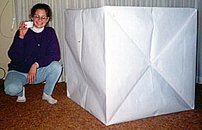 In fourth grade I became interested in the Japanese art of origami (paper folding) and in a frenzy of youthful enthusiasm began experimenting with huge versions made by taping together newspapers to make enormous sheets of paper up to 15 x 15 feet. The image above shows a reproduction of one of my efforts back then, a paper box large enough for an adult to climb inside. That's my daughter next to it holding a conventional sized folded paper box.