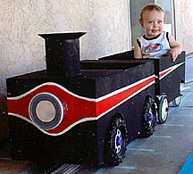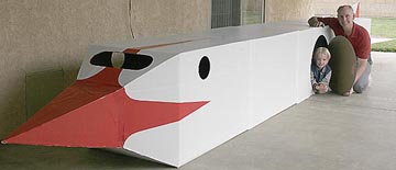 I covered six 28 x 28 x 56-inch boxed with red and white contact paper and connected them, after a little sculpting to create the proper effect, to create a 30-foot long spaceship that's large enough for myself and several grandchildren to crawl around inside. The interior walls have over a dozen dials with moveable pointers for navigation, life support, and engine function as well as ten electric lights, a console with a moving track. Whoever's driving has to steer a course around planets, comets, and stars. In the rear is an engine with sequentially flashing colored lights to simulate warp drive.