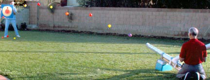While in a fit of militaristic frenzy, I dreamed up the terror weapon pictured above. It uses two 4-foot lengths of 4-inch diameter plastic pipe, one "Y" union, and a gas-powered blower to fire a stream of colored plastic balls. At maximum power this cannon fired 10 balls per second at a range of 70 feet. The real terror in this terror weapon wasn't from the balls, which were too soft and light to hurt anyone even if struck in the face, but that the thing was so ridiculous that one was in danger of laughing oneself to death.
