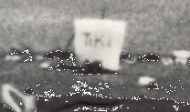 This poor old photo is the only picture I have of the "Tiki," a thirteen-foot long trimaran sailboat with a square-rigged sail. The blob in front of the sail is my best friend, Gary Cozakos (The same guy that almost got toasted with a flame thrower I built back in high school.). I built the boat when I was in high school. Why is this an insane project? Because everything, including the mast but not the sails and ropes, was made out of cardboard. This picture was taken at Santa Monica Beach in Southern California using a Polaroid camera.