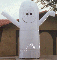 This is Wilbur, a 14-foot tall ghost. I made him out of white, disposable plastic tablecloths. He's inflated with a fan in the back. The air exits through his arms which bend and wave. Wilbur never fails to make kids, and adults, smile when I set him up on Halloween.