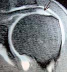 To examine the soft tissues of the shoulder with an MRI it was first necessary to have an Arthurgram done. In this procedure, a CAT scan (An X-ray where the area to be examined slowly slides through a large ring around which the X-ray emitter is rotated. The output is fed to a computer which combines all the data into a three dimensional image of the bones.) is used to pinpoint the location of the shoulder joint so that the needle of a syringe can be inserted into the gap between the bones of the joint and a dye injected. This sounds painful but I didn't feel a thing. The doctor used a topical anesthetic to dull the skin so there was no initial "prick" then injected anesthetic ahead of the needle as it was pushed in so that it was always entering dulled tissue. (This is a great technique, which I wish everyone who gives shots or takes blood samples would use.) The dye fills the layers between the soft tissues and shows up as bright areas on the MRI.