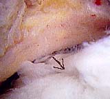 The wedge shaped light area indicated by the arrow is dye that had entered an void where there should be no void.