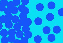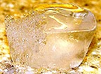In the picture above the densely packed blue spheres on the left represent water molecules solidified into ice, the looser spheres on the right are water molecules. Ice consists of water molecules locked in a crystalline structure. Liquid water consists of free water molecules randomly moving around in all directions. (Note: in reality ice is less dense than water, which is why it floats. As water freezes the growing crystaline structure forces water molicules further apart than they are in liquid water. I've drawn the ice as close-packed molecules to simplify the image.)