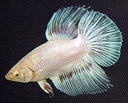 Meet Whitey. He's slightly smaller than Flame Junior. He is absolutely pure white. There isn't the tiniest spot of red anywhere on him. Also, at full display his tail fans out to 150 degrees, which classifies him as a super-delta... just short of a Halfmoon.