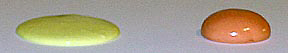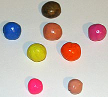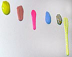 The six on the top are original Silly Putty by Binney and Smith. The two on the bottom are by Ja-Ru and are slightly different shades: the coral is pinker and the magenta is brighter. For a much wider range of colors I recommend visiting the Thinking Putty site at http://www.puttyworld.com/products.html. They sell 1/5-pound tins of it for $8 to $9 dollars. They offer four different glow-in-the-dark colors alone! The following picture is of their amber glowing putty: