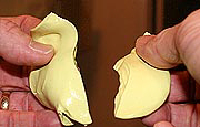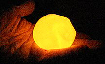 Even more interesting about this glow putty is that it is faintly triboluminescent, meaning that when it's discharged you can see a flash of light when it it is quickly stretched or torn in half. This phenomenon is similar to the flash seen when a wintergreen lifesaver is crushed. (Please check out the WINTERGREEN LIFESAVER FLASH page to see what this looks like.) The flash given off by glow-in-the-dark Thinking putty is extremely faint, requiring an ISO of 3200 and two stacked 100-percent contrast enhancements to make it even faintly visible in a photograph. Such as it is, here it is: