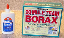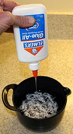 Slowly drizzle Elmer's white glue (Elmer's white school glue works the best) into to water, moving around so the strands are spread around. (I found that a great way to do this is to stir the water so that it's swirling around clockwise in the bowl. Then drizzle the glue in at one spot. The moving water will carry the stream away so you don't get a clot that might not mix well. The swirling water will automatically carry the strands to the center of the bowl. Drizzle from about 18-inches above the surface of the water so that the stream has enough speed to punch down through the surface. Otherwise surface tension may trap it on the surface and slow the reaction.