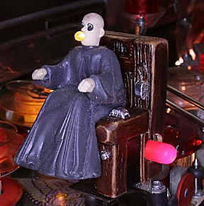 I think it looks much more real. It was difficult getting it back on the metal bracket but after a lot pushing and shoving I managed to do so. Unfortunately, all this handling wiped off some of the ink from the corners and edges of the chair. I started to touch it up but decided not to because from the normal playing distance it gives the chair an aged look that's appropriate for a old family heirloom. It's amazing the impact this mod has on the overall appearance of the playfield. It gives it a richer, more sophisticated look. The chair is high and in the center of the playfield so it attracts a lot of attention. Improving its appearance does a lot for the game.