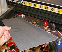 Light from the dot matrix display reflects off the playfield cover glass and into the player's eye. These reflections obscure most of the action and toys in the top quarter of the playfield. I found that these reflections could be blocked by taking a 20-inch long by 7-inch wide piece of black poster board, bending 3/4-inch of one long edge up about 30-degrees