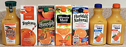 We tested more different types of orange juice in half-gallon cartons than I care to list, both fresh and made from concentrate. The best tasting juice over all was Tropicana's orange juice with calcium and extra vitamin C. The health advantages, if any, of the additives had nothing to do with this selection other than in some way they made the juice taste better (more orangy) than any of the others.