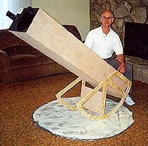 The telescope I use is a binocular with eight-inch f8 mirrors for objectives. Originally, it was mounted on the motorized mount pictured above that the observer sat in. It gave the impression of flying through the heavens. However, this system, featured in the July, 1996 issue of Sky & Telescope magazine, was too bulky so it has been remounted in a conventional dobsonian mount. Here's what it looks like now: