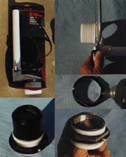 The upper left-hand picture shows the flush valve as purchased. Remove all the hardware from it and cut the threaded section off the valve body (upper right-hand picture). Drill two mounting holes in the flange of the large nut (middle right-hand picture) that comes with the valve. Screw the threaded section into the large nut and use aluminum tape (about four layers at three, equally spaced places) to reduce the inside diameter of the threaded tube (bottom right-hand picture) so that the barrel of a two-inch eyepiece slides in snugly. The lower left-hand photo shows a finished focuser with a 50 mm Plossl eyepiece. Use screws to mount the eyepiece holder to the side of the telescope.