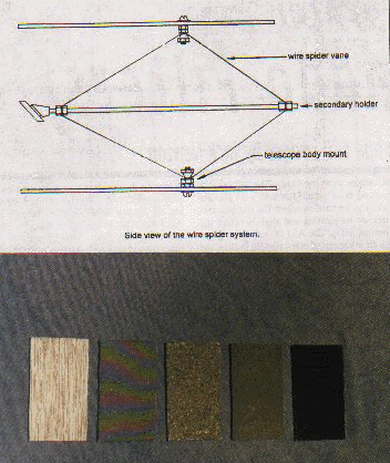 I have been using a set of wire spiders based on these plans for an 8-inch, F8 telescope for the last ten years and have enjoyed excellent results with them. The wires are 0.008 inch diameter guitar strings. I found that these wire vanes reduced the intensity of the diffraction spikes by half when compared to standard, 0.020 inch thick vanes. The spikes from the wires were so fine that they could not be detected in stars less than first magnitude. In contrast, regular vanes produced spikes that could easily be seen in stars down to 2nd magnitude.