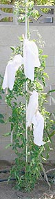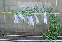 This technique keeps the plants neat and clean and their slender columnar shape allows several to be crowded into a small area. In the image above of a Sweet Baby Girl cherry tomato, the strings of ripening fruits are wrapped in white cloth to protect them from sunburn.