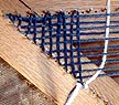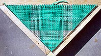 Scrounging around the garage, I turned up a box of 1 and 1/4 inch finishing nails and a 59 inch piece of 2 x 2 inch pine. (Pine is a little soft for a loom intended for many projects. The nails might pull out over time. Using a hardwood would made a much more durable frame.) Applying a little high school geometry I calculated the angles and lengths required for the three rails of the frame. Joining the corners with three inch drywall screws created a sturdy frame. I then drew a line 1/4 inch in from the inside edge of the frame all the way around it. Along the long upper arm of the frame I drilled holes every 1/2 inch along this line and pounded a nail into each one. I used a plastic draftsman's square to provide a 90 degree drop from each of these nails to where it crossed the line on the side rails. I then added additional marks halfway between each of these marks to double the number of positions for nails. As you will see a couple of pictures further down this page, every time yarn is looped over a nail on the top rail two vertical lines of yarn (wefts) are created. But, every time a line of yarn is carried from one side rail nail to the other, only one horizontal line of yarn (a warp) is created. Therefore, to have the same number of horizontal and vertical lines of yarn there has to be twice as many nails per inch on the side rails as on the top rail. If the number of nails were the same then the vertical lines of yarn would quickly start to angle toward the center of the frame and the grid of crisscrossed yarns wouldn't be square.