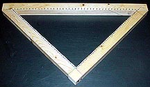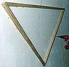 A triangle loom consists of a triangular frame with a 90 degree angle at the bottom and 45 degree angles at the two upper corners. The frame can be made out of any wood that is smooth enough so that it doesn't snag the yarn. Nails are pounded into the face of the frame close the inside edge. These nails are usually 1/2 inch apart on the top rail and approximately 1/4 inch apart down each of the sides. The wood should be predrilled for the nails to prevent splitting.