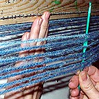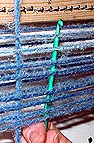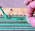 Reaching up through the warps to snag the loose yarn