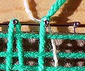It's very easy at this point to misread the warps and drag the loop over or under the wrong line. I found that overlapping the needles so they both went over and under a few of the same warps helped avoid this confusion.