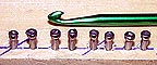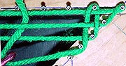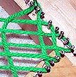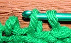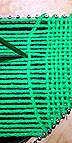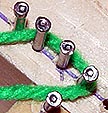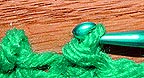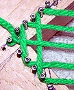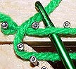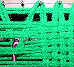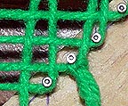 The picture above shows a loop that's been brought down through the warps on a larger project. It needs to have it's left and right sides hooked around the nails on both sides and tightened. (When dealing with this many warps, it might save time and effort to switch from a crochet needle to a weaving needle, a long, bunt-pointed needle with an eye.)