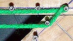 Notice in the last picture that the loose end of the yarn is once again going up and out of the picture. For the next weaving, the same process is repeated except this time the loop is started on the right side. Weaving is simply a matter of repeating the process of dragging loops down from one side, hooking them on a nail, widening the loop as it's dragged sideways across the warps, and hooking it on the next nail down on the opposite side.