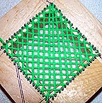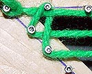 At the left side I brought the yarn over and around the next nail, (again skipping every other nail to open up the weave for viewing convenience) down and around the nail below it and back to the right.