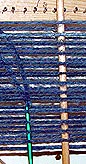 By this time the fibers were starting to pull out of the yarn of the top warps. The soap was still preventing the loops from tangling as I brought them down but the warps were starting to snag a little when I separated them (cleared the sheds) prior to bringing a new loop down. I think what is happening is that the soap is being drawn toward the center of the yarn. As this happens, it's pulled away from the surface and the fibers are exposed. Fortunately, they still have enough soap on them to prevent most of the tangles.