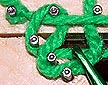 This knot has to be very strong, small and be able to be trimmed very close so that the loose ends of yarn aren't visible. A very tight square knot worked perfectly. (The only yarn I could find at home that was a different color was some that I "borrowed" from my wife's collection for her knitting machine. It's much finer than what I started with and didn't work very well. From this I learned that I want to use yarn that is all the same weight.)