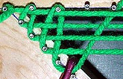 Look closely at the two wefts circling the top nail next to the corner nail above. The weft coming down from the right side of this nail goes under the top warp and over the second warp. The weft on the left side of the nail does the opposite. It goes over then under the same two warps. It's essential to make sure that the wefts alternate in this manner. There are two ways of doing this. First, every time you bring a new loop down you can take a close look at where the last loop went to see if it started off going over or under the top warp and do the opposite with the new loop. Second, you could follow the program of always bringing the new loop over the top warp when you are starting the new loop on the right side and under the top warp if you are starting the loop on the left side.