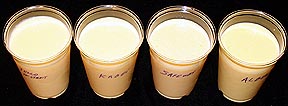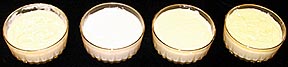 From left to right: the non-fat, 1-percent and 2-percent milks produced puddings that had a slightly translucent appearance and a weak gelatinous texture that lacked the rich smoothness one expects from good vanilla pudding. Whole milk produced the best results. The half and half and cream were too thick and buttery. The cream in particular had a coarse, grainy texture. Also, the half and half and cream-based puddings were too white.
