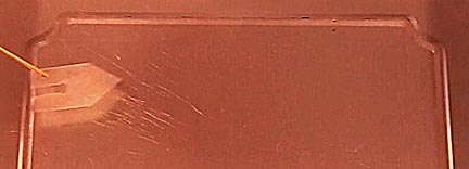 The one problem with this demonstration is that the small amount of soap introduced into the pan is enough to eliminate the surface tension over the entire surface, so a second attempt to make the scooter scoot will fail. To repeat the experiment, it's necessary to rinse the pan and replace the water.