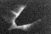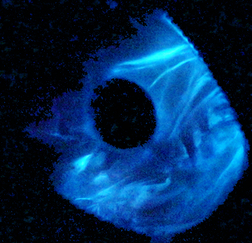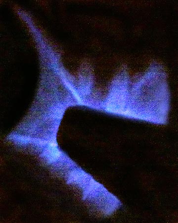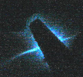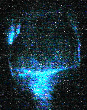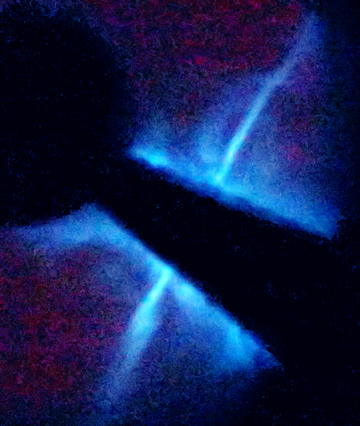 For years I've heard about the flash of light that's supposed to occur when a wintergreen lifesaver is crushed, but never believed is was true. Finally, I tested it and was delighted to discover that the flash really does happen. It's extremely faint, quick, and has a cyan color. I failed several times to capture the event on film. Even ASA 800 film was far to slow to capture the flash. Success came when I used Kodak's TMAX ASA 3200 black and white film and had it push processed to ASA 6400. The picture below, after my photo processor optically enhanced it, was the result. The wedge-shaped object surrounded by the flash is the tip of a pair of needle-nosed pliers as they crushed the lifesaver to cause it to flash. Simply breaking the lifesaver didn't produce enough light to record.