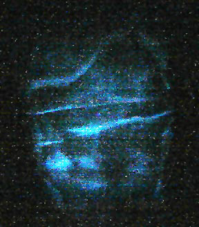 Even at ISO 3200 the original image was completely black. I had to increase the contrast 96 percent to bring out the image, with the result that a lot of noise was introduced. Still, the image is larger and in color, which is better than my first attempt. Similar to the first attempt there are bright rays emanating along fracture lines in the lifesaver that look brighter because they emit light directly into the camera. All the other light was emitted under the plier jaw and had to diffuse outward through the lifesaver to be visible.